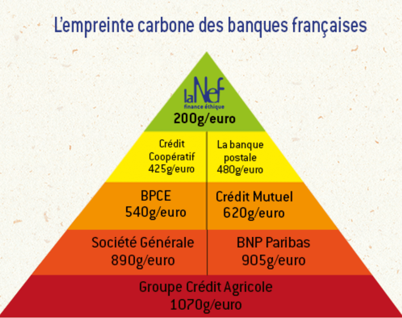 Et pourtant. L’argent que vous placez en banque finance des projets indispensables à l’économie, certes… mais polluants. Voire même parfois très polluants : en 2019, un rapport d’Oxfam et des Amis de de la Terre a tenté de calculer l’empreinte carbone des banques françaises. Résultat ? Si vous êtes dans une des 3 plus grandes banques françaises (Crédit Agricole, Crédit Lyonnais ou Société Générale), ces 10K pèsent…. à peu près 10 tonnes équivalent carbone. Soit pratiquement autant que l’impact environnemental de votre consommation annuelle… 😱
